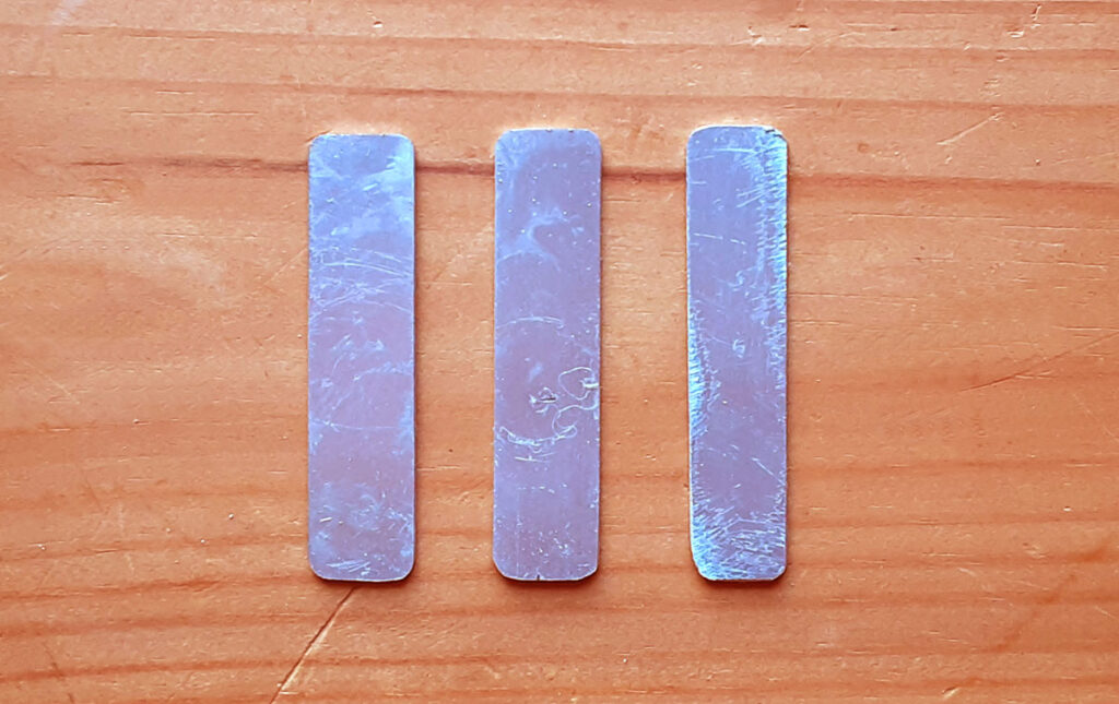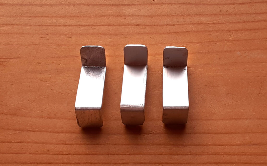 固定器具を作ります。適当な金属板が無かったのでコの字アルミチャンネルを角の部分で切り、三枚の板を確保、切り口を整えてペンチで曲げ完成。