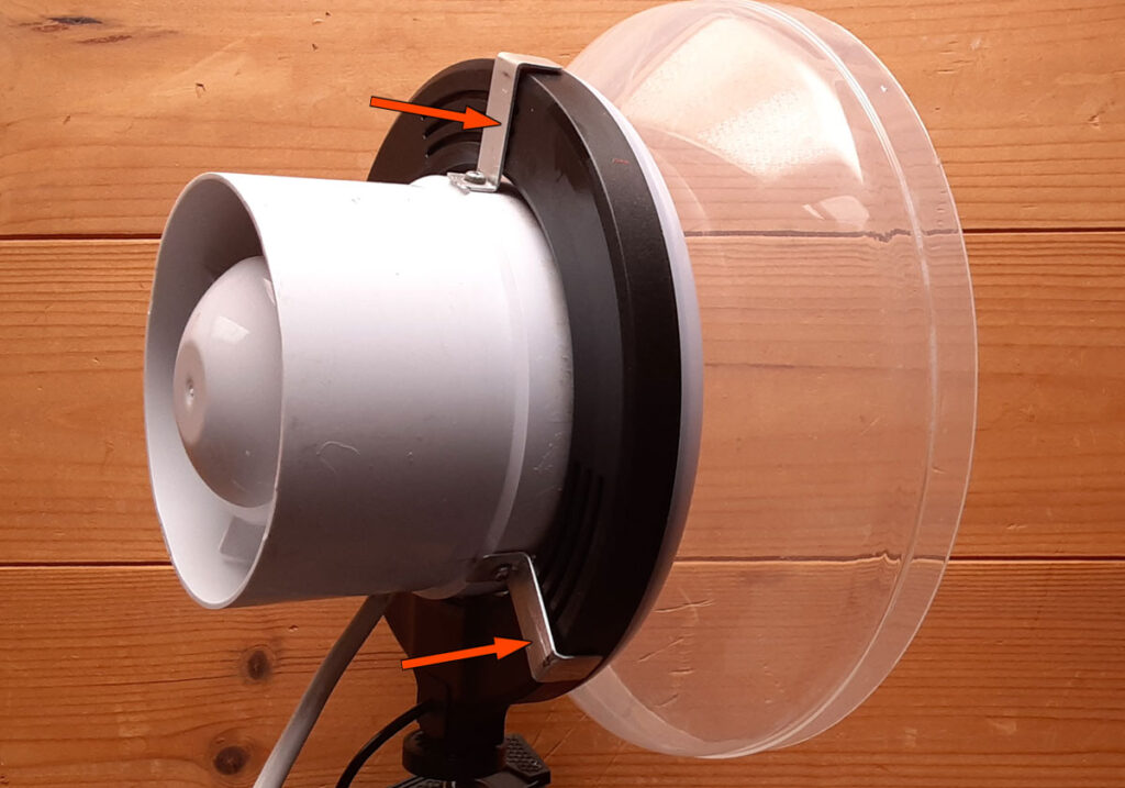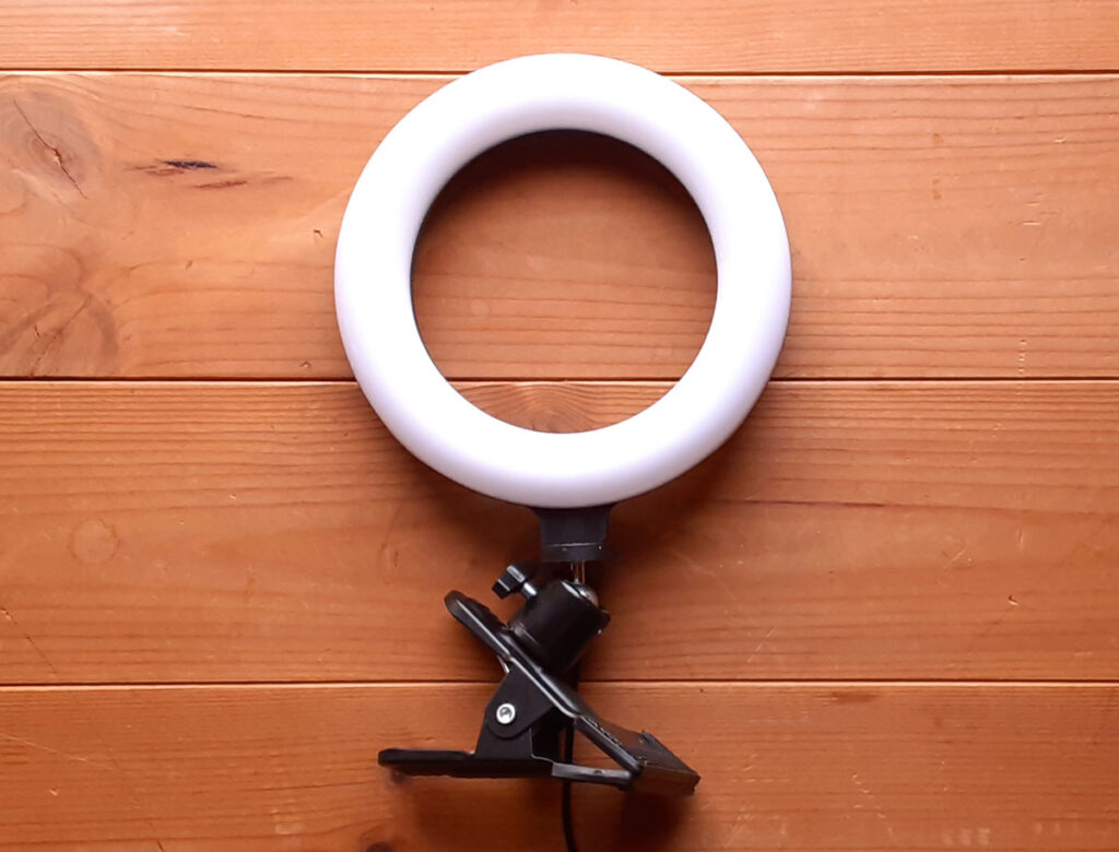 これで固定することによりリングライトと換気扇が一体化、リングライトのボールジョイントで自在に向きが変えられます。