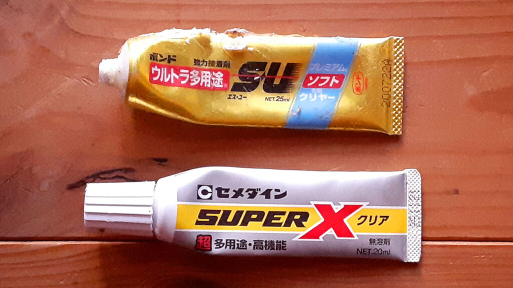 上が片面塗タイプ。下は両面塗タイプ、両面に塗り込んでしばらくして合わせて圧着させます。箇所によって使い分けました。穴をふさぐ革には一発貼りさせたかったので片面塗タイプ。靴底はじっくりア圧着させたかったので両面塗タイプ。