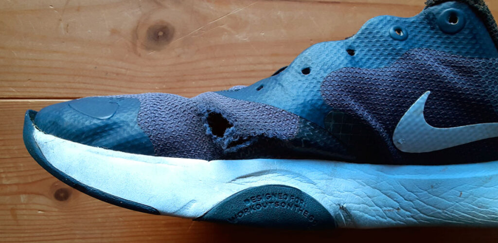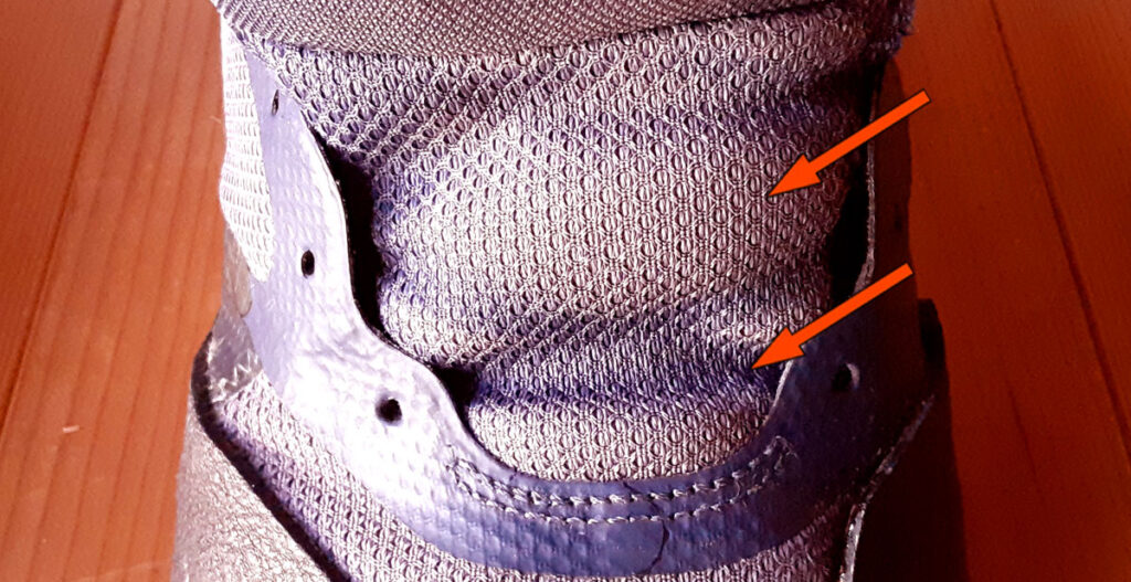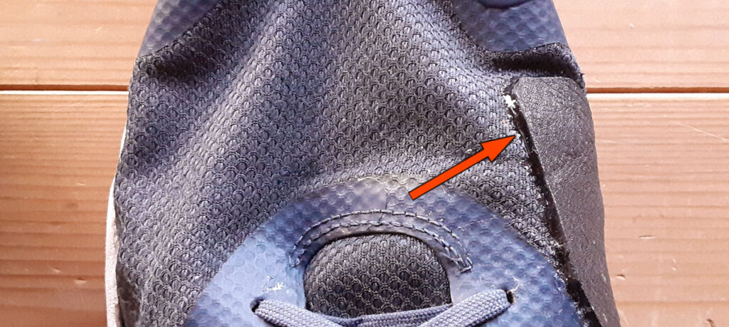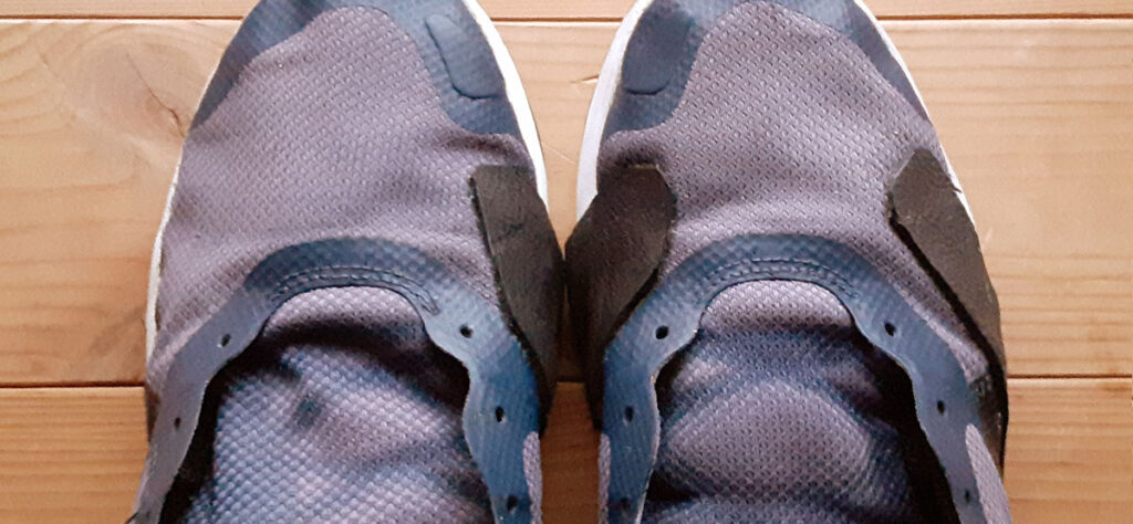 私は大変な外反母趾、この出っ張りに当たり、いつの間にか(痛くはない)擦り切れ穴が開いてしまいます。この修理から始めることにします。
