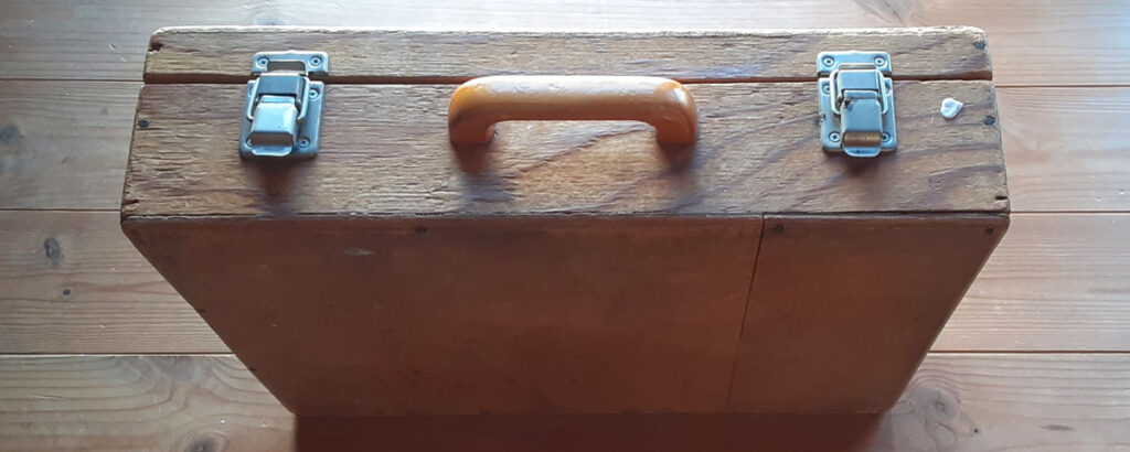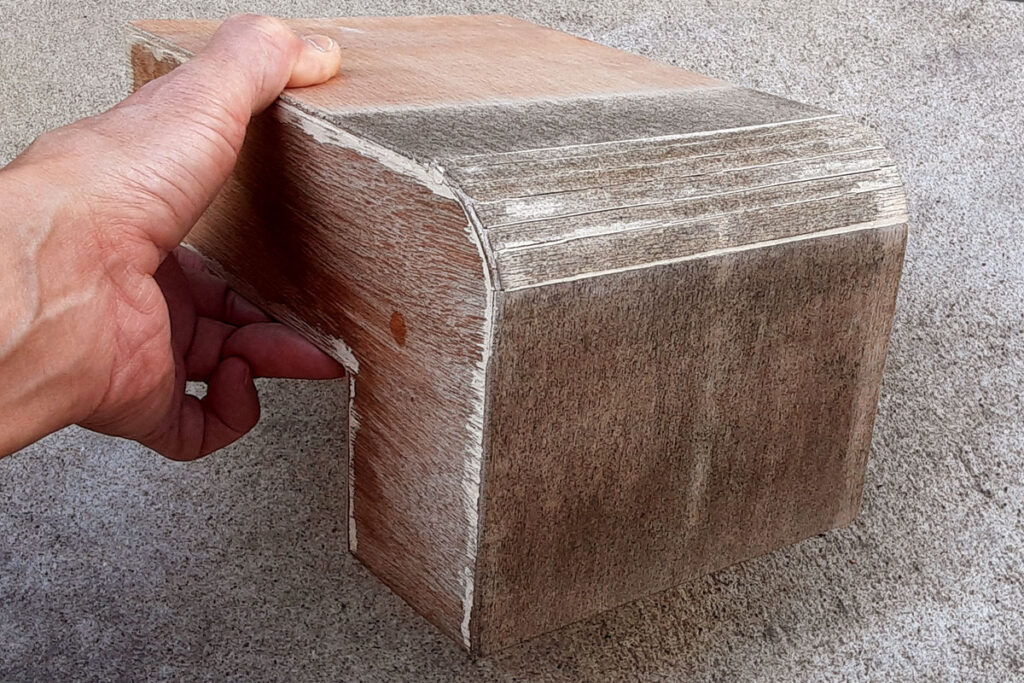 以前パソコン周辺機器のスキャナーを入れるために作った木製ケース。この蓋が大きさ的にピッタリなのです。これにスライド引き出しのレールを取り付け机の裏側に仕込みます。削り作業の時には引き出してここで削りカスを受け止めます。また、物が大きい時には取り外して太腿の上に置けば作業範囲も広がります。