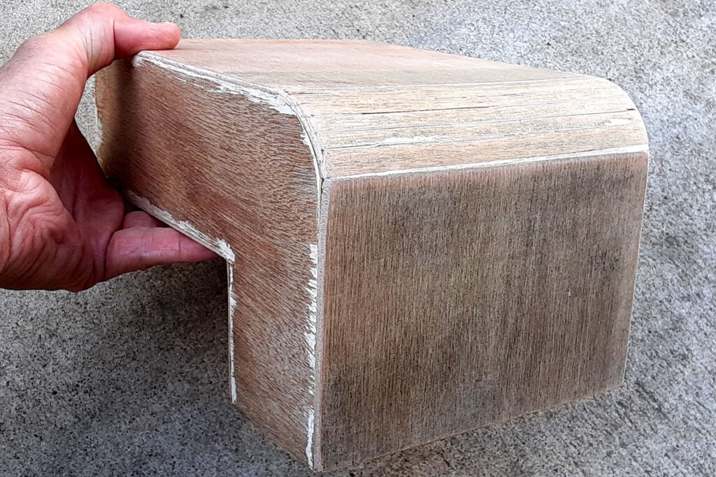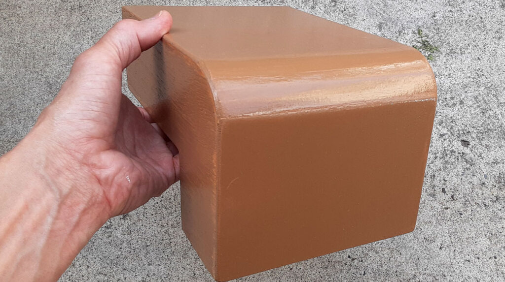 このカーブ部分、パテを塗り込んでいるのですが、木材側に収縮が起こったらしく隙間が空いてしまいました。ここから雨水が染み込み、ダクト内側まで達し、カビが発生してしまっていたのですね。隙間に瞬間接着剤を染み込ませ、パテを塗り込みさらに研磨します。