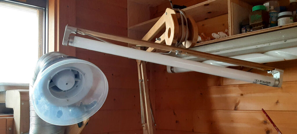 まずは照明。こちらには以前作った排塵装置に付属しているリングライトと主に着彩作業に特化したトゥルーライトを装備させましたが、リングライトだけではちょっと光量が足りない。トゥルーライトを点灯するとなると40wなので電気消費が心配‥‥という事で新たなる光源を欲していました。